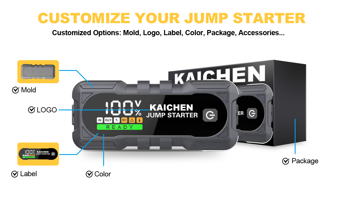 Since its inception, Kaichen has introduced numerous technological innovations and a wide variety of new products that address the specific needs of different clients around the world. We are constantly improving our jump starter battery technology and multifunctional applications to address the increasingly intense market competition. After more than a decade of product optimization and upgrades, our 12V Jump Starter, 12V & 24V Jump Starter, and Air Compressor can be widely used in various scenarios, including different types of vehicles, travel, and emergency rescue.